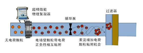 強(qiáng)磁高頻除垢儀產(chǎn)生電場作用于電荷,并施加給通過設(shè)備的微小顆粒,顆 粒所帶電荷的正負(fù)性將使顆粒粘附在一起。在有大量紊流的地方,這樣的粘附機(jī) 會就會大大增加。