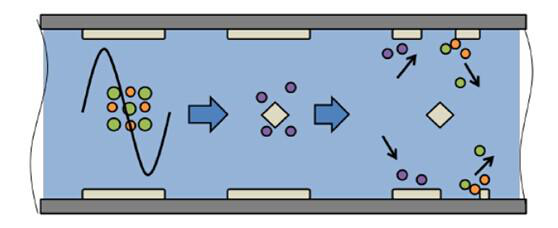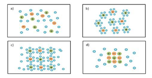 這些正負(fù)離子原本在過飽和狀態(tài)時結(jié)晶在管道側(cè)壁上。現(xiàn)在有了交變電場, 使正負(fù)離子快速往返運動(如上圖),并粘附形成凝塊(如下圖 a,b)。強(qiáng)磁高頻除垢儀產(chǎn)生的電磁波信號有助于離子結(jié)晶(如下圖 c)。在過飽和狀態(tài)下, 松散凝塊形成穩(wěn)定晶體(如下圖 d)。該晶體因電磁波的不斷作用,在水中可長 期保持。實際經(jīng)驗表明,即使離開強(qiáng)磁高頻除垢儀的作用,該晶體也可以維持 半小時。