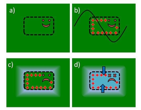 a 圖為正常生存狀態(tài)下的細(xì)菌,通過強(qiáng)磁高頻除垢儀設(shè)備后,帶電荷(如 b 圖),電荷的正負(fù)吸引性使細(xì)胞外壁形成超純凈水的潤濕層(如 c 圖),滲透 作用迫使純水進(jìn)入細(xì)胞體內(nèi),殺滅細(xì)菌或水藻孢子(如 d 圖)。